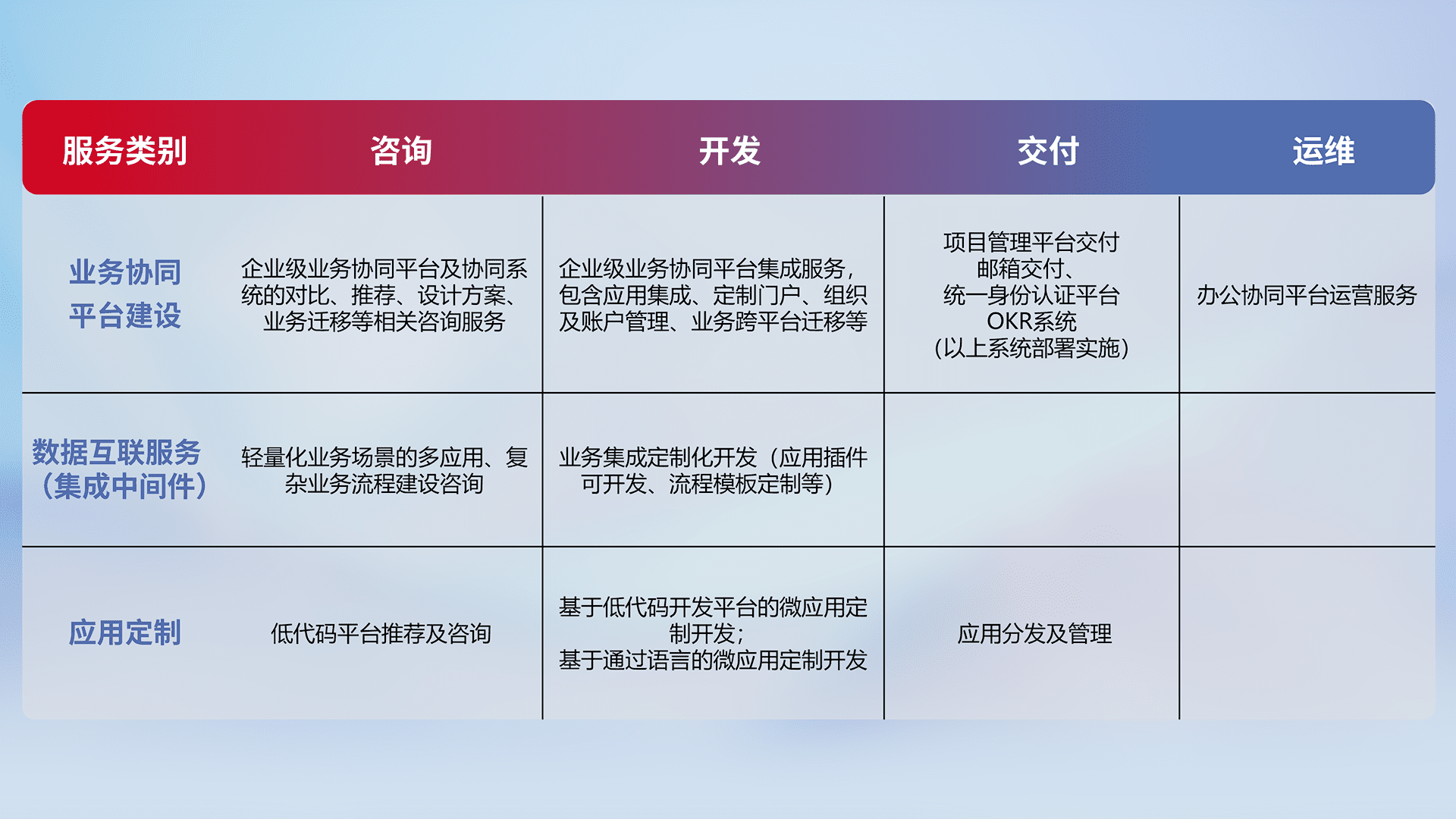 针对特定行业场景的全代码开发服务,,,精确足满足客户业务服务及系统定制化需求。。重点服务汽车、、农业、、制造业等高端高质量客户。。。提供如专业管理系统、、定制化门户、、、、业务工作台等开发落地。。。。