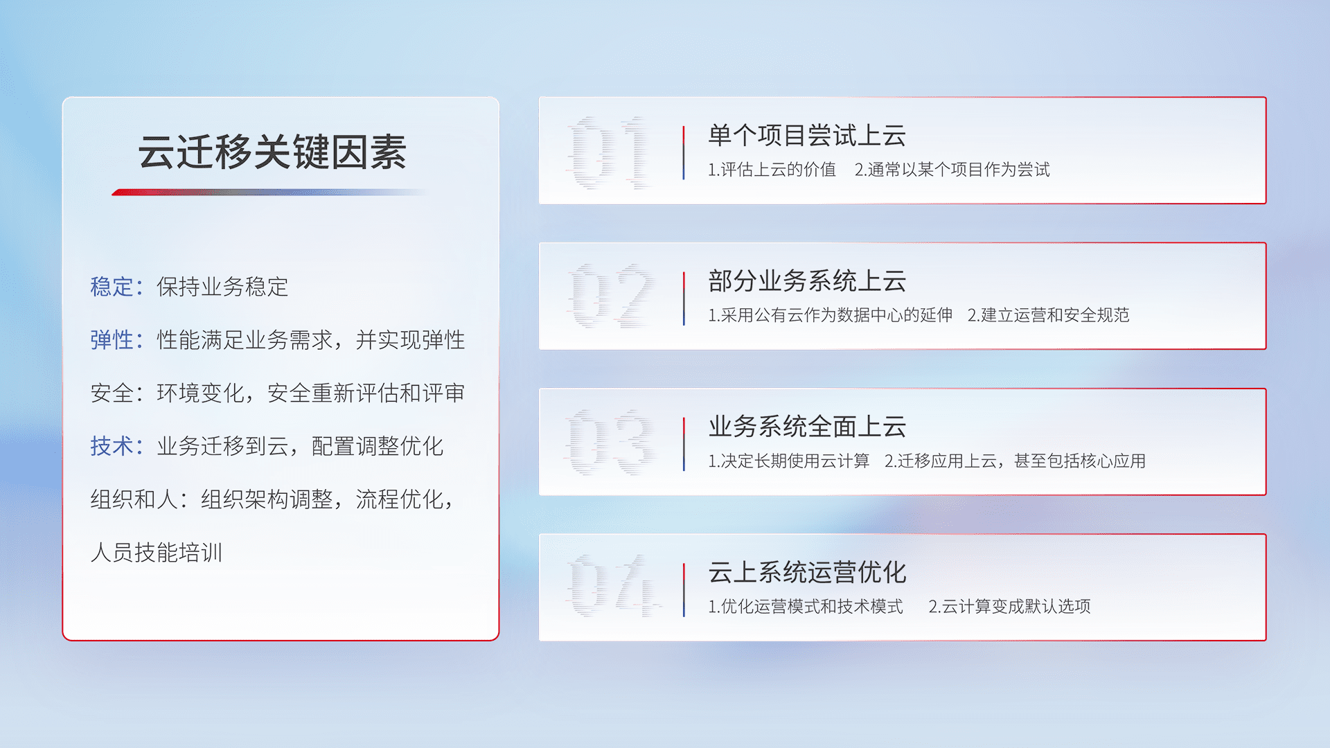 结合实际业务,,从规划设计、、云平台选型、、、、云原生改造、、、、数据迁移、、、、集成交付,,迁移全过程为客户识别最佳上云路径,,,,做好风险识别管理,,,设计网络架构、、身份权限、、、安全审计合规、、操作审计、、、、日志审计、、监控告警策略、、多站点容灾设计等,,,对云上基础设施进行整体规划,,提升IT治理水平,,以满足弹性、、、高可用、、、高性能的需求。。。