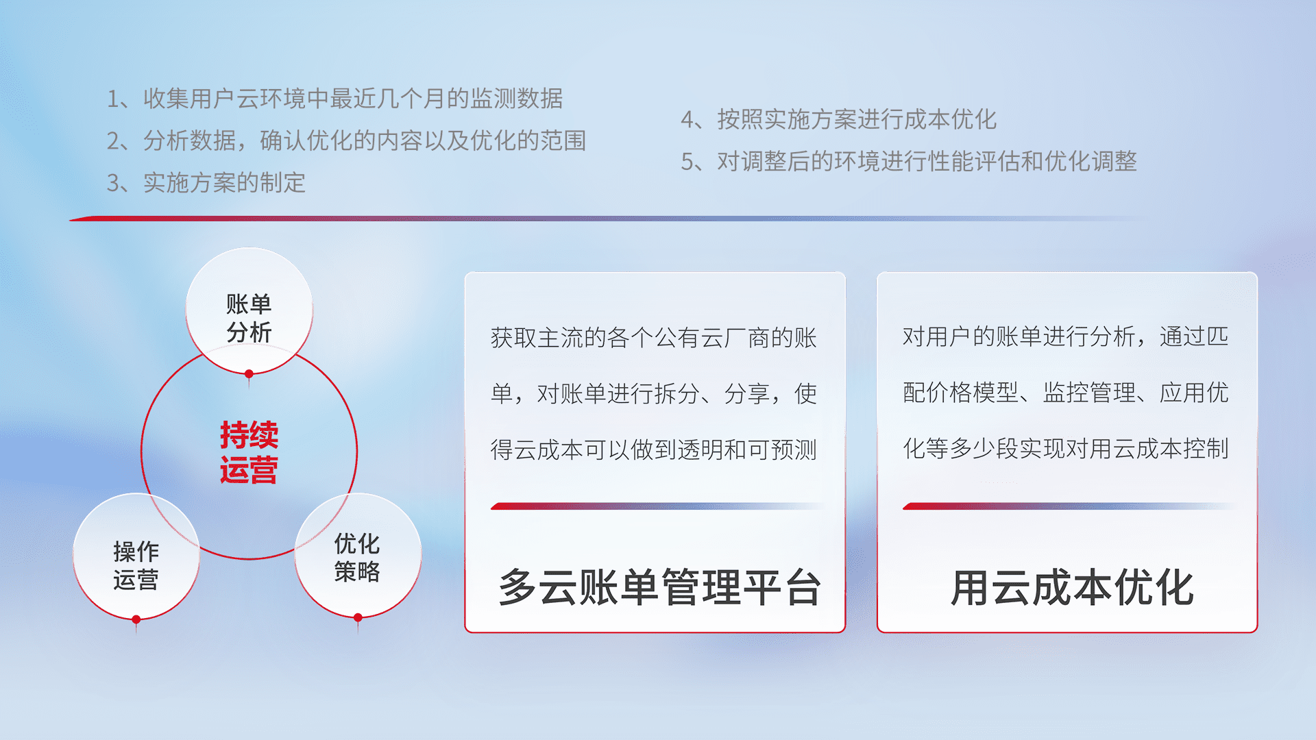 通过多云纳管,,,,以统一的资源数据模型把客户的云资源进行抽象和封装,,进而实现对多云资源的统一操作,,,保障云资源管理的可靠性、、、稳定性与可用性。。。。量身定制化运维内容,,,,配置、、开发运维、、、、补丁管理、、备份、、监控、、认证和访问管理、、、、审计和日常巡检等,,保障在用云过程中的可靠度,,,,稳定度以及高可用率。。