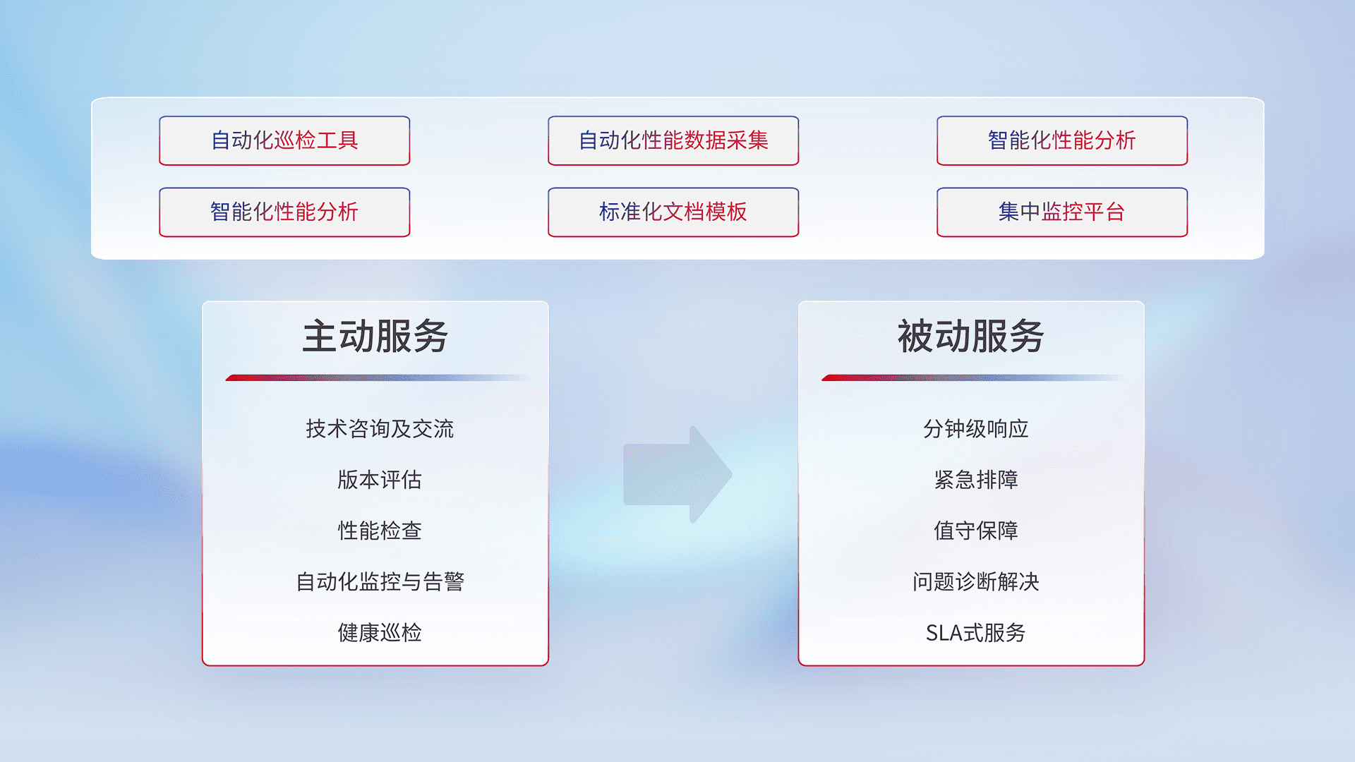 智能化工具和标准化文档,,,保障服务质量,,提供主动服务(包含技术咨询、、、版本评估、、、、性能检查、、、自动化监控与告警、、健康巡检)和被动服务包含(分钟级响应、、、紧急排障、、、值守保障、、、问题诊断解决、、SLA服务)。。。